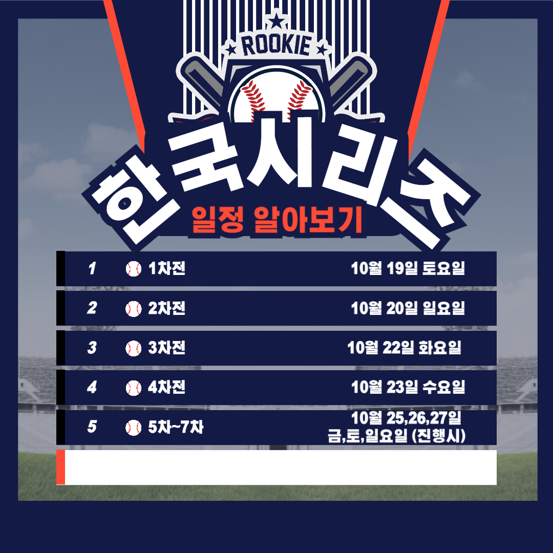 대망의 한국시리즈입니다. 정규시즌 우승도 중요하지만 한국시리즈 우승이 진정한 마무리라는 생각이 듭니다. 한국시리즈는 7전 4선 승제로 진행됩니다. 2일 경기, 1일 휴식(이동일)을 두 번 반복하고 남은 3경기는 정규시즌 1위 팀의 홈구장에서 연달아 치르게 됩니다.